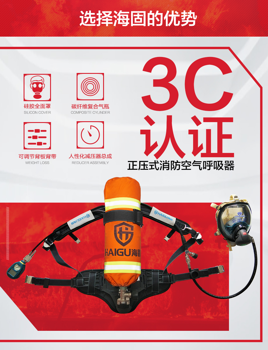 海固RHZK9/A 正压式消防空气呼吸器可以使消防人员和抢险救护人员在进行灭火战斗或抢险救援时防止吸入有毒有害气体、粉尘颗粒物,也可在化学品事故泄漏、化工、石油、冷库、船舶、冶炼、电力、实验室、矿山、燃气开采运输等缺氧环境中使用,从而有效地进行灭火、抢险救灾救护和特种劳动作业。
